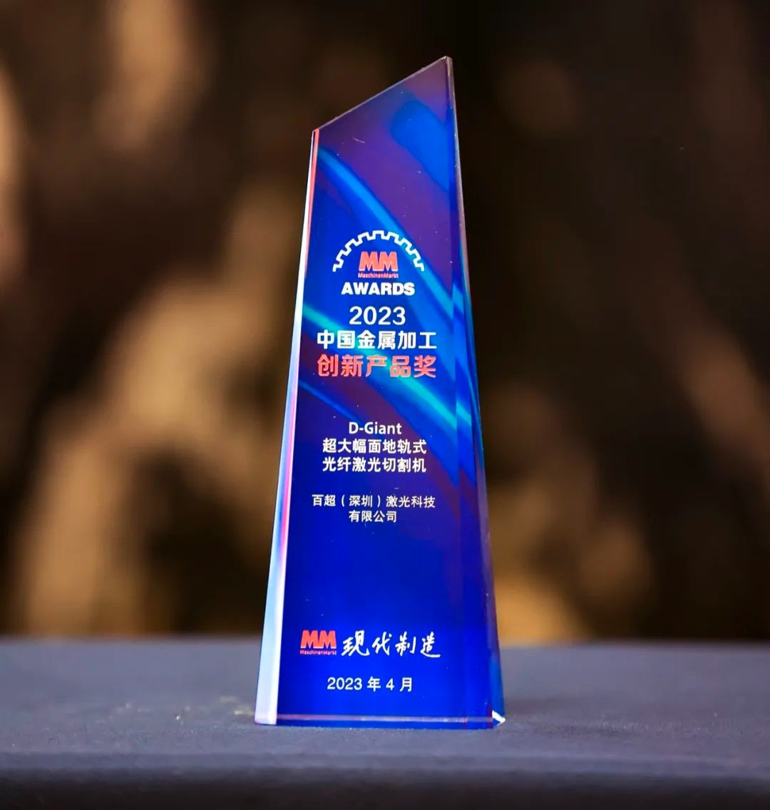 為更好發揮數控機床產業鏈對高端制造的生產價值,弘揚中國金屬加工企業不斷創新的工業精神,MM《現代制造》全媒體借中國最大規模數控機床展CIMT2023大舞臺,針對當前金屬加工行業和市場熱點產品,第10次啟動“MM AWARD中國金屬加工創新產品獎”評選活動,頒獎典禮于2023年4月12日在北京“第十九屆中國國際金屬加工高峰論壇”上隆重舉行。在此次評選活動中,百超(深圳)自主研發的D-Giant超大幅面地軌式光纖激光切割機榮獲MM《現代制造》2023“MM AWARD”中國金屬加工創新產品獎”。此次獲獎是行業對百超(深圳)持續創新的又一次高度認可。